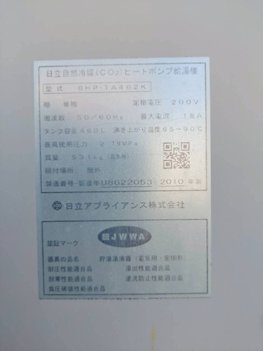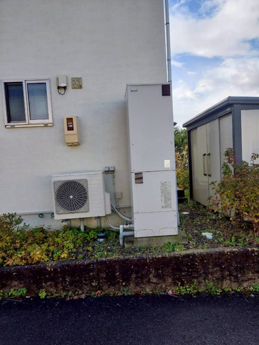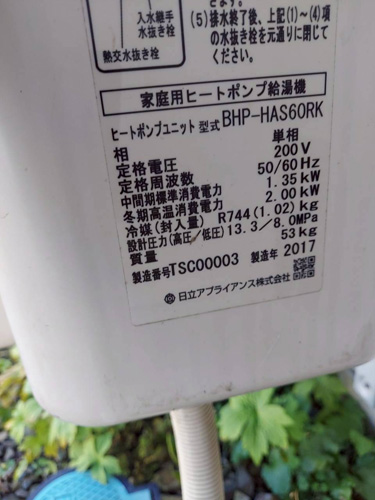 甲州市塩山下於曽 日立家庭用ヒートポンプ給湯機ヒートポンプユニットBHP-HAS60RK、自然冷媒CO2ヒートポンプ給湯機BHP-TA462K→コロナ自然冷媒CO2家庭用ヒートポンプ給湯機ヒートポンプユニットCHP-DZ451K エコキュート交換工事
